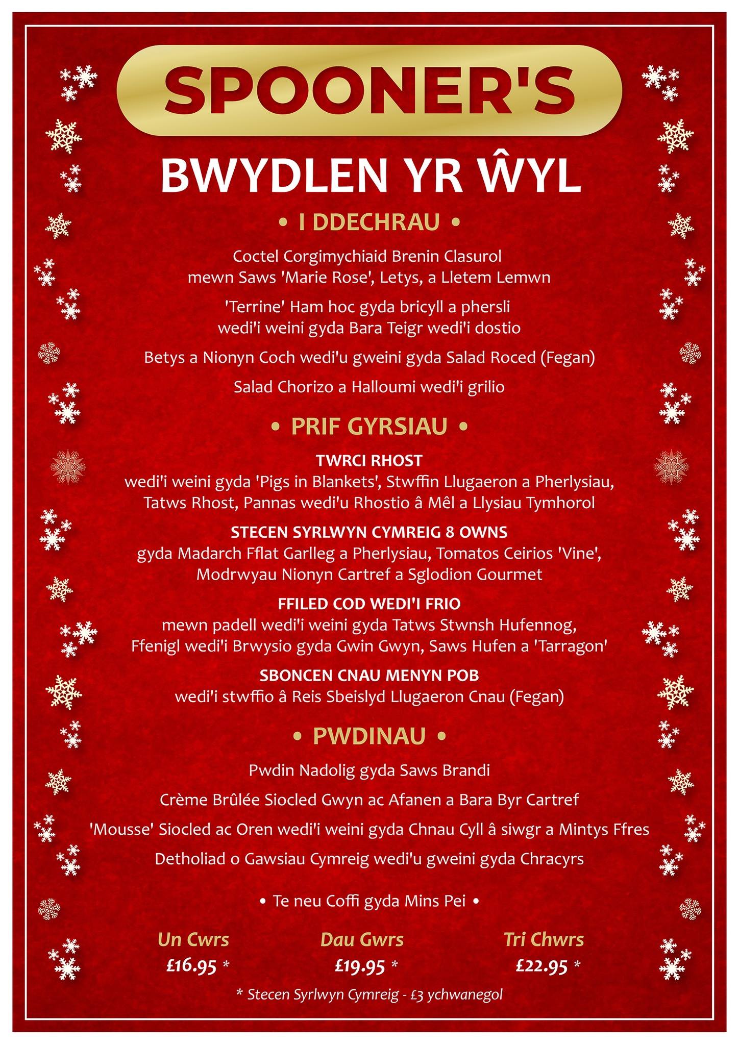 Bydd ein bwydlenni Nadoligaidd yn lansio ar yr 28ain o Dachwedd, a byddant ar gael rhwng 12:00 a 20:00 (slotiau archebu hwyraf am 19:30) bob dydd Gwener tan y 19eg o Ragfyr.